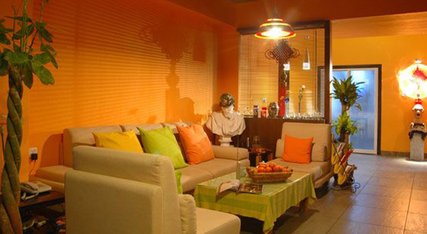 ห้องพักผ่อน ในโทนสีร้อน เน้นการจัดวางชุดโต๊ะเก้าอี้ไม้สีเข้ม ในบรรยากาศห้องโทนสีส้มอิฐ แถมยังเพิ่มสีสันในห้องด้วยพรมลายสีแดงเข้ม และมีหมอนรองหลังสีน้ำเงินสด หากแต่ความร้อนแรงดูนุ่มนวลลงด้วยม่านบางพลิ้วไหวสีขาวสะอาดตา และสวนสวยภายนอก ซึ่งดึงเอาสีเขียวนั้นเข้ามาเป็นมุมสดชื่นเล็กๆ อยู่ภายในด้วยการจัดวางแจกันไม้ประดับตามมุมห้อง เสน่ห์ห้องพักผ่อนห้องนี้อยู่ที่สีสันร้อนแรงแต่อบอุ่นแบบตะวันออก ซึ่งผสมผสานกันอย่างลงตัว