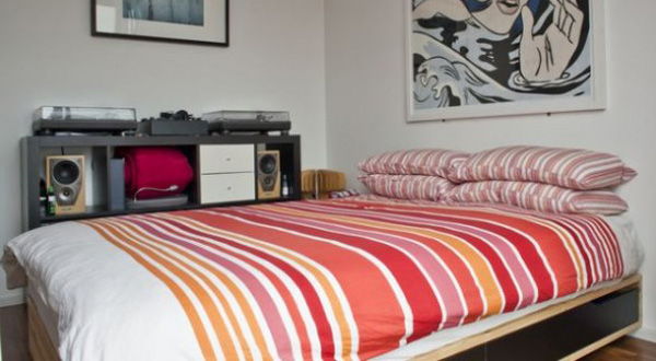มุมหนึ่งของห้องพักผ่อน สามารถตกแต่งให้โมเดิร์นได้ด้วยการจับคู่สีต่างอย่าง แดง-ดำ มาจัดวางผ่านเฟอร์นิเจอร์รูปทรงทันสมัย อย่างชุดโซฟาสีดำทรงเรียบแต่เก๋ด้วยขาสเตนเลสสีเงิน สไตล์ไปกันได้กับโซฟาเล็กสีแดง โดยมีสตูลสีแดงสดทรงกลมเบรกรูปทรงเหลี่ยมๆ ไว้ บางครั้งการจัดวางเฟอร์นิเจอร์น้อยชิ้นในคู่สีต่างกันก็ทำให้ห้องธรรมดาๆ ดูโมเดิร์นขึ้นมาได้ความต่างที่ลงตัว