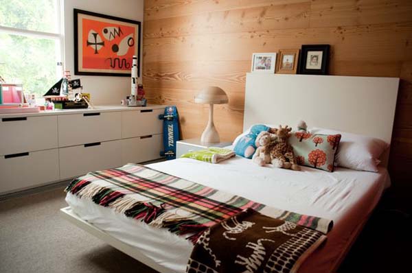 ห้องนอนห้องนี้ก็จะใช้ผนังไม้ที่เป็นแผ่นติดเรียงเป็นแนวนอนและจะใช้ที่นอนสีขาวแต่ลูกเล่นก็จะอยู่ที่หมอน