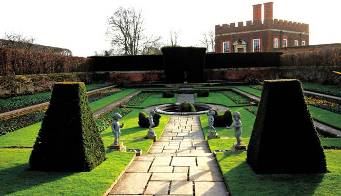 5. (Flower Bed)  แม้แต่สวนขนาดเล็กก็สามารถปรับให้เป็นสวน Formal Style แบบสวนฝรั่งเศสได้ โดยใช้เส้นสายรอบนอกเป็นองค์ประกอบในการสร้างความน่าสนใจให้กับสวน เช่น กระบะต้นไม้ทรงสี่เหลี่ยม 2 ชุด ปลูกต้นไม้ที่มีลำต้นในแนวตั้งเพื่อให้เป็นจุดเด่น ตัดแต่งพุ่มไม้เป็นรูปปิรามิดหรือแท่งรูปสี่เหลี่ยมปลายแหลม (Obelisk) และปลูกพืชคลุมดินที่โคนต้น ซึ่งสามารถนำวิธีนี้ไปใช้ได้ไม่ว่าคุณต้องการสวนสมัยใหม่แบบเรียบง่ายหรือ สวนแบบคลาสสิก