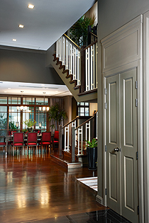 ส่วนของบานหน้าต่างหรือประตูที่เป็นวัสดุทึบแสง ก็อาจปรับเปลี่ยนโดยกรุด้วยกระจกใสตัดแสง เพื่อเปิดมุมมองและสร้างความรู้สึกโล่งโปร่งแทน ส่วนโทนสีโดยรวมของบ้านนั้น ก็ควรเลือกตกแต่งคุมโทนสีของพื้น ผนัง เพดานและเฟอร์นิเจอร์ให้เป็นไปในทิศทางเดียวกัน เพื่อให้แลดูสะอาดตา รวมทั้งเพิ่มโทนสีเด่นเป็นเฉดสีในวรรณะเย็น เช่น สีฟ้าหรือสีเขียวช่วยให้บรรยากาศภายในบ้านแลดูสดชื่นสบายตา