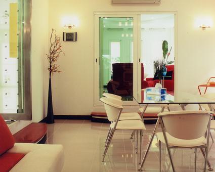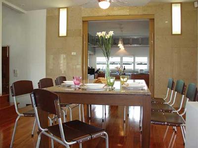 ห้องอาหารนี้ยังคงความเป็นแนวร่วมสมัยอย่างชัดเจน ดีไซด์ของโต๊ะอาหารที่เรียบง่าย เน้นการตกแต่งด้วยของน้อยชิ้น โคมไฟเพดานดูออกแนวโอเรียนทัลเล็กน้อย แต่ก็เป็นการ Mix & Match ได้อย่างกลมกลืน