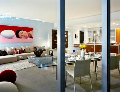 ห้องนั่งเล่นที่เชื่อมต่อกันกับโต๊ะทานอาหาร