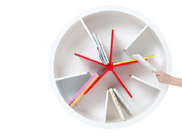 ไอเดียชั้นวางหนังสือดีไซน์สวยๆๆมีมากให้ดูกันอีกแล้วค่ะกับ ชั้นวางหนังสือ Need Not Arrange Anymore โดยการออกแบบของ Kim Ji-hye ซึ่งตัวชั้นวางหนังสือจะมีลักษณะเป็นวงกลมและจะมีแกนตรงกลาง ดูแล้วสวยแปลกตาดีค่ะ