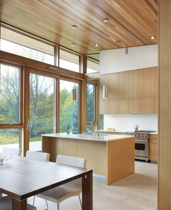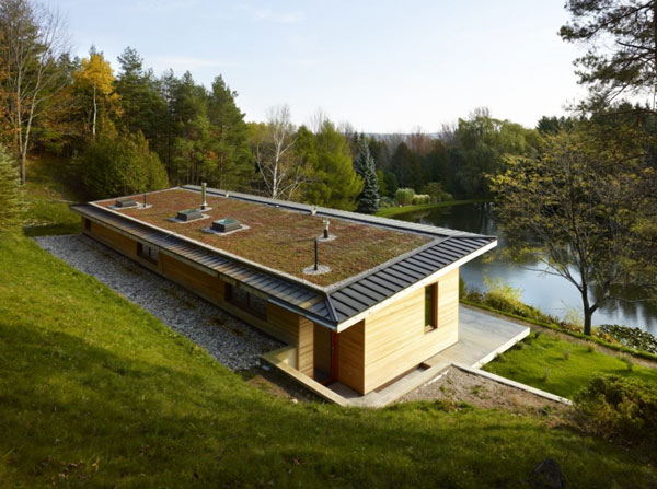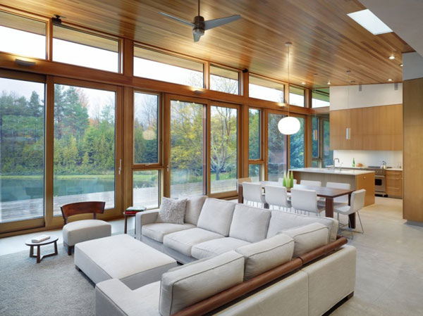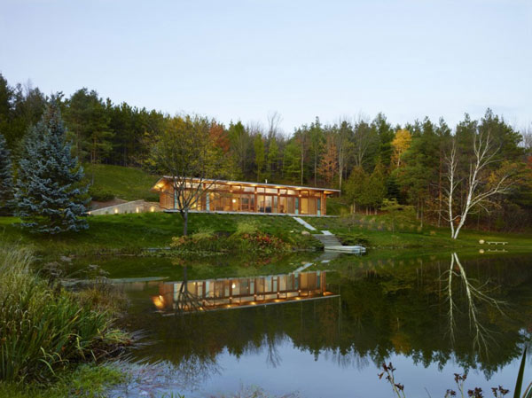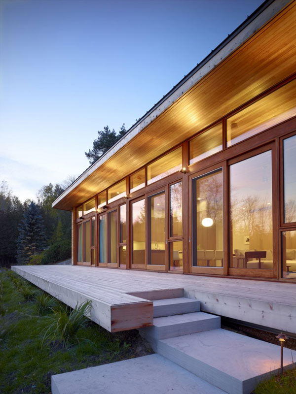 บ้านชั้นเดียวหลังนี้ตั้งอยู่ที่แคนาดา อยู่บนเนินเขา ถูกออกแบบเป็นสี่เหลี่ยมผืนผ้า ภายนอกและภายในตกแต่งด้วยไม้ โครงสร้างหลักเป็นปูน ระเบียงไม้ยาวเชื่อมกันหมดทุกห้อง บานประตูและหน้าต่างหน้าบ้านถูกใส่ด้วยกระจกใสเพื่อให้เห็นการเปลี่ยนแปลงตามฤูุดูกาลในทะเลสาปและธรรมชาติโดยรอบ มีห้องนอนอยู่ด้านซ้ายสุดและด้านขวาสุด  ออกแบบโดย Toronto-based