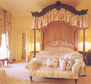 3.  หวานๆ โรแมนติก สไตล์ Old English Style เป็นบรรยากาศที่ดูน่าสบายเหมือนอยู่ในทุ่งดอกกุหลาบ เตียงนอนสี่เสาติดม่านระบายรอบเตียงและมีทิ้งชายยาวข้างหัวเตียง หัวเตียงเล่น curve ได้อย่างลงตัว ความเด่นของห้องหนีไม่พ้นลวดลายและความเนี๊ยบของเสาทั้งสี่ต้น นอกจากนี้ยังมี Bench ลายดอกกุหลาบ ผ้าม่านเป็นผ้าพิมพ์ลายเดียวกันกับม่านระบายรอบเตียง เพิ่มความหวานเข้าไปอีกด้วยการใช้พรมสีโทนออกชมพูม่วง เพื่อเพิ่มความสว่างให้กับห้อง เหมือนเดินอยู่ท่ามกลางสวนกุหลาบทีเดียว