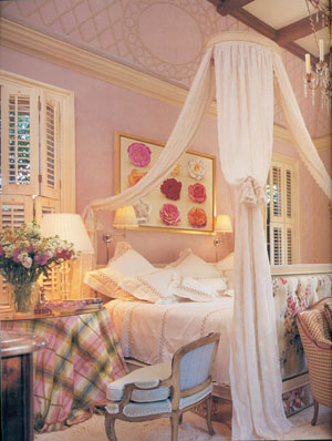 4.  หวานๆ มีเสน่ห์ แบบ Classic Style ห้องนี้ให้ความหรูหราแบบชนชั้นสูง เลือกใช้สีชมพูอ่อนจากดอกกุกลาบเพื่อความสง่างามและเย็นตา สร้างความโรแมนติกด้วยกระโจม ผ้าโปร่ง ผูกชายไว้ทั้งสี่เสา สีของปลอกหมอยและผ้านวม เลือกใช้สีขาวโดยมีลายตัดเป็นสีน้ำตาลอ่อนให้ความนุ่มและคงไว้ซึ่งความมีรสนิยม รูปถ่ายกรอบทองเหนือหัวเตียงเพียงรูปเดียวสร้างความหรูหราเพิ่มขึ้น และการเลือกใช้เฟอร์นิเจอร์ไม้และผ้าคลุมโต๊ะข้างหัวเตียงลายสก๊อตช่วยทำให้ดูย้อนยุค มีการใช้บัวประตู หน้าต่างและเพดานเพื่อเพิ่มความอ่อนช้อย นอกจากนี้ หน้าต่างบานเกล็ดซึ่งทำจากไม้เหมาะสำหรับภาพลักษณ์แบบยุโรปหรือโคโลเนียล สามารถใช้ประโยชน์ได้หลากหลายจากหน้าต่างบานใหญ่นี้ โดยแบ่งออกเป็น 2 ส่วน ข้างบนและข้างล่าง คุณสามารถปิดด้านล่างเพื่อความเป็นส่วนตัว และเปิดด้านบนเพื่อรับแสงอาทิตย์ยามเช้า
