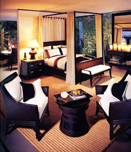 5. Modern Tropical Style เป็นอีกหนึ่งสไตล์ยอดฮิตในขณะนี้ ห้องนี้เลือกแต่งสไตล์ modern tropical style ผสมผสานกับแนว resort โดยใช้เตียงสี่เสาสี Dark Oak เป็นตัวเอกของห้อง และเพื่อลดความเข้มลงจึงมีการใช้ม่านโปร่งทั้ง 3 ด้านของเตียง เพื่อเน้นความเป็นตะวันออกมากขึ้นจึงให้เฟอร์นิเจอร์หวายสีออก โทนเข้มเน้นให้ห้องดูหรูหรามาก ด้วยความที่เฟอร์นิเจอร์ส่วนใหญ่ของห้องเป็นสีเข้ม ดังนั้นสีครีมจึงเป็นอีกสีหลักที่เป็นส่วนประกอบของหลักเฟอร์นิเจอร์ด้วยเช่นกันเพื่อเป็นการ เพิ่มความสว่างให้กับห้อง