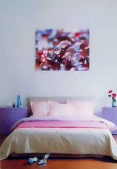 7. ท้ายสุด Modern Chic ถ้าไม่มีการนำเสนอการแต่งห้องแนวนี้คงมีหลายๆ คนน้อยใจ เพราะสไตล์การแต่งห้องแนวนี้เป็นแนวใหม่ และกำลังได้รับความนิยมในหมู่คนรุ่นใหม่ เป็นสไตล์การผสมผสานของความหลากหลาย และมีการเติมสีสัน เรียกได้ว่าเป็นการหยิบเล็กผสมน้อยของสไตล์ต่างๆ ห้องที่นำมาเสนอนี้ เป็นแบบเรียบๆ แนว modern แต่มีการใช้สีโทนชมพูม่วง เป็นหลัก ทำให้สีเป็นตัวแสดงออกถึงความหวาน เติมสีสันให้กับห้องด้วยโต๊ะหัวเตียงสีม่วง และเติมความโดดเด่นเพิ่มเข้าไปด้วยภาพพลอยหลากสี เป็นตัวแทนของสไตล์โบฮีเมียน