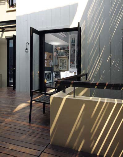 เฉลียงกลางแจ้งอันร่มรื่นบนชั้นสอง เชื่อมต่อและแบ่งแยกบ้านทั้งสองหลังนี้ เนื่องจากบ้านสร้างเกือบเต็มพื้นที่ พี่เขยผู้ออกแบบบ้านหลังนี้จึงออกแบบผนังระแนงไม้ที่สูงเป็นพิเศษ ช่วยกั้นมุมมองทางสายตา และยังช่วยให้เฉลียงนี้มีความร่มรื่นอีกด้วย