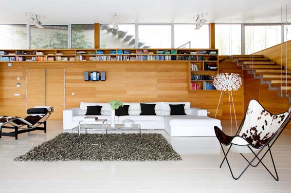 เป็นมุมพักผ่อนที่จัดพื้นที่ได้อย่างประหยัดพื้นที่อีกแบบหนึ่งด้วยการใช้ผนังห้องที่ทำจากไม้จะจะไม่ชั้นวางของไว้ด้านบน