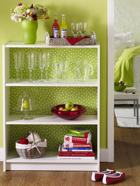 DIY แบบที่ 1 ติดกระดาษสีสันน่ารัก เพิ่มลวดลายให้ชั้นวางดูเป็นมิติมากขึ้น