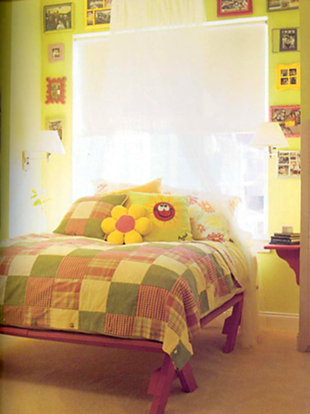 พิ่มสีสันให้กับห้องนอน ด้วยการนำเศษผ้ามาปะติดปะต่อกัน เลือกใช้ผ้าโทนสีเขียวของฤดูใบไม้ผลิ และสีชมพูสดใส ทำเป็นผ้านวมคลุมเตียง ปลอกหมอน จัดวางเตียงนอนให้ได้รับแสงสว่างอย่างเต็มที่ค่ะ เพื่อสร้างบรรยากาศให้เหมือนเวลาออกไปปิกนิคข้างนอก เพิ่มลูกเล่นอีกนิดด้วยการจัดวางกรอบรูปของครอบครัวไว้รอบๆ ผนังห้อง เหนือเตียงนอนแสนสวย เท่านี้ห้องนอนของคุณก็แปลกไม่ซ้ำใครแล้วล่ะค่ะ