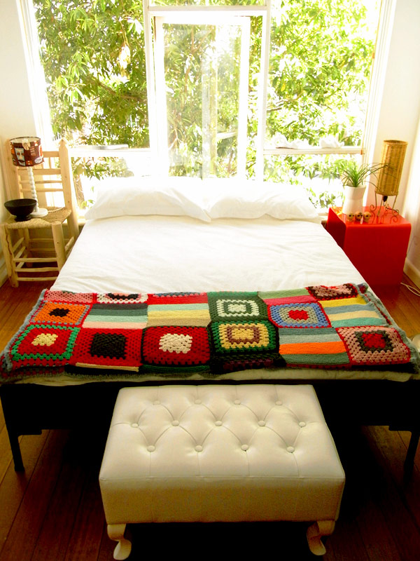 ห้องนอนนั้นเธอได้จัดให้หัวเตียงติดกับขอบหน้าต่างเพื่อให้รับกับบรรยากาศธรรมชาติด้านนอกประดับด้วยลายผ้าที่ถักด้วยได้สีสันสดในสวยๆ