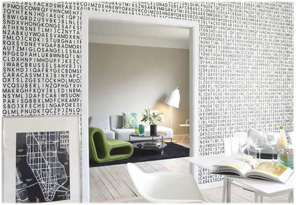 ไอเดียวอลเปเปอร์จากการออกแบบของ Mr.Perswall ถ้าคุณเป็นคนชอบอ่านแล้วอยากแต่งบ้านให้เก๋ด้วยวอลเปเปอร์ลายไม่ซ้ำใคร จะต้องสนใจแน่ๆ กับวอลเปเปอร์ที่เป็นตัวหนังสือภาษาอังกฤษ ตัดสลับขาว-ดำ นี้ ซึ่งนอกจากความชิคของลวดลายแล้ว ถ้าหากว่ามองดีๆ จะพบว่าในตัวหนังสือที่ดูไม่เป็นคำเหล่านี้ซ่อนปริศนาอักษรไว้เป็นชื่อเมืองต่างๆ ทั่วโลก ที่เจอตอนนี้ก็มี STOCKHOLM SINGAPORE LONDON NEWYORK  BERLIN ลองมองหากันดีๆ ใครเจอเมืองอะไรอีกบ้าง …  เอาไว้เวลานั่งชิลๆ จิบกาแฟ ก็ใช้สายตากวาดตาเล่นเกมมองหาปริศนาอักษรบนผนังบ้านตัวเองได้เลย
