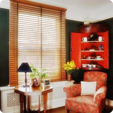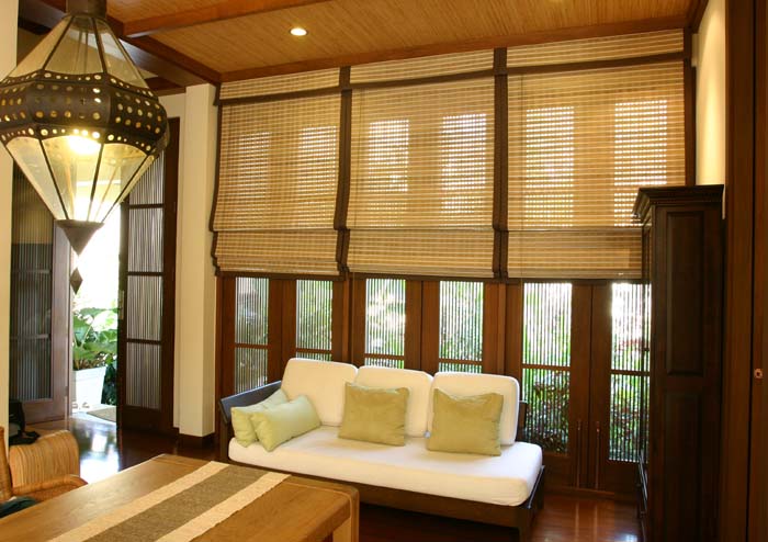 ห้องนั่งเล่น หรือรับแขกเป็นมุมที่ใช้บ่อยในช่วงเวลากลางวัน  จึงเป็นห้องที่ต้องการแสงธรรมชาติมากที่สุดห้องหนึ่งของบ้าน ขณะเดียวกันเพราะเป็นห้องที่เน้นความรู้สึกผ่อนคลาย จึงนิยมใช้วัสดุไม้มาประกอบการตกแต่งเสมอ รวมไปถึงมู่ลี่ไม้ที่ช่วยสร้างดีไซน์ให้กลมกลืนกับห้อง ทั้งยังสามารถปรับระดับมู่ลี่เพื่อรับแสงในแบบที่ต้องการ ทำให้ได้แสงเงาเป็นลาย ทว่าเมื่อปิดทึบก็ยังให้ความรู้สึกอบอุ่นเช่นเดิม