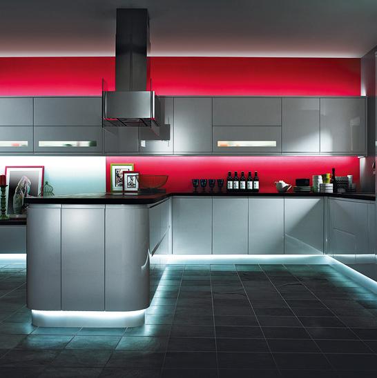 ใช้สีแดงและเพิ่มลูกเล่นให้กับห้องครัวด้วยการติดไฟที่พื้นก็ดูดีทีเดียว