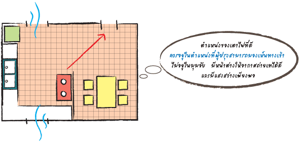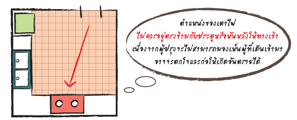 2.ตำแหน่งของเตาไฟ ไม่ควรอยู่กับอ่างล้างจานและตู้เย็น เนื่องจากธาตุน้ำไม่ควรอยู่ใกล้ธาตุไฟ และความร้อนจะส่งผลให้ตู้เย็น เสื่อมสภาพเร็วกว่าปกติ และม่ควรจัดวางไว้ตรงกลาง เนื่องจากพลังร้ายจะส่งผลให้คนในบ้านเจ็บป่วยเป็นโรคเกี่ยวกับหัวใจได้ นอกจากนี้ตำแหน่งของเตาไฟยังไม่ควรอยู่ตรงข้ามกับอ่างล้างจานอีกด้วย เพราะจะปะทะกันโดยตรง ทำให้ผู้ที่ชอบเข้าครัวมีอารมณ์ฉุนเฉียวและโมโหง่าย อีกทั้งยังทำให้มีสุขภาพไม่ดีอีกด้วย