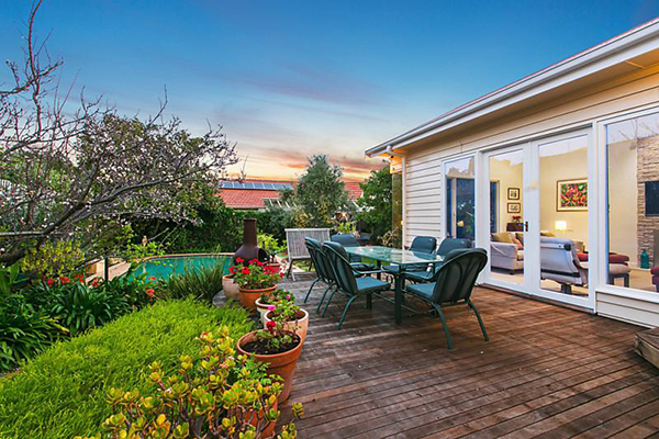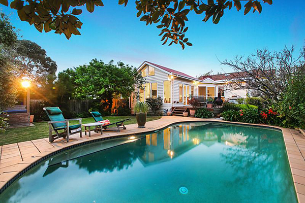 แบบบ้านชั้นเดียวสไตล์วินเทจ บ้านไม้สีขาว ตกแต่งบริเวณนอกบ้านด้วยต้นไม้และกระถางดอกไม้ พื้นระเบียงไม้ทำให้ขับตัวบ้านให้โดดเด่นมากทีเดียว มีทางเดินทอดยาวไปยังสระว่ายน้ำ บรรยากาศภายนอกบ้านรู้สึกถึงความรื่นร่มไปกับธรรมชาติ