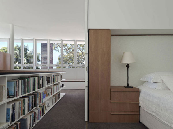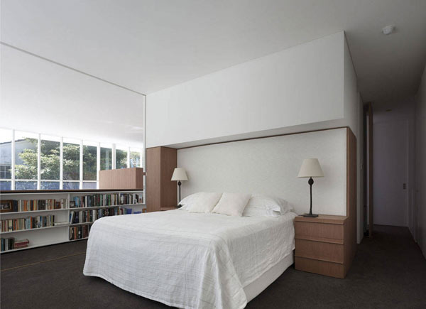 ภายในห้องนอนถูกปูด้วยผ้าปูที่นอนสีขาวตัดกับพรมสีเทา มีชั้นหนังสืออยู่ริมหน้าต่าง