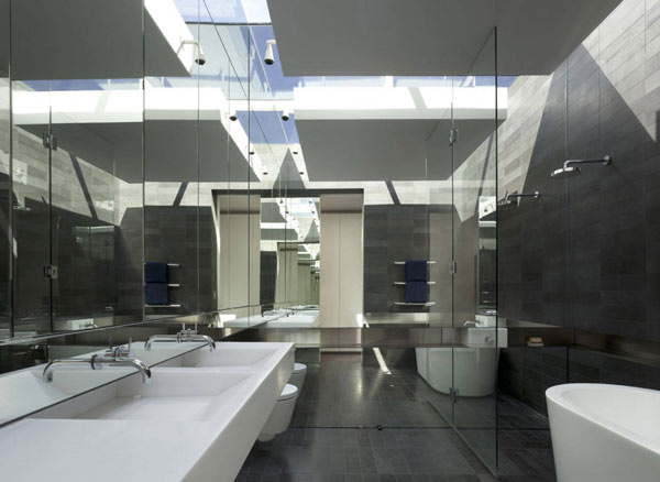 การตกแต่งห้องน้ำเลือกใช้สีดำและสีขาวเป็นหลัก มีกระจกเงารอบห้องทำให้ห้องน้ำดูกว้างใหญ่มีมิติ