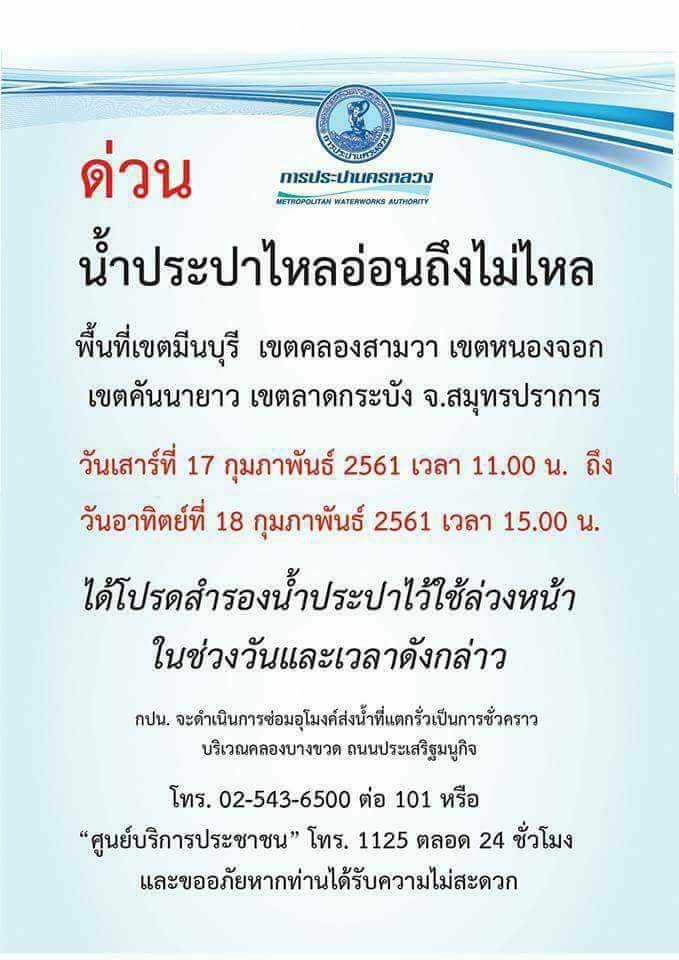 17-18 กุมภาฯ นี้ กปน. เตรียมซ่อมท่อส่งน้ำ ประชาชนย่านมีนบุรี ลาดกระบัง สมุทรปราการ โปรดสำรองน้ำประปา