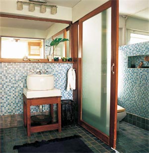 ดลชัยสร้างห้องน้ำสำหรับแขกเพิ่มเติมที่ส่วนศาลา ผนังโมเสกในโทนสีฟ้า อ่างล้างมือเป็นงานออกแบบของอู้ พหลโยธิน