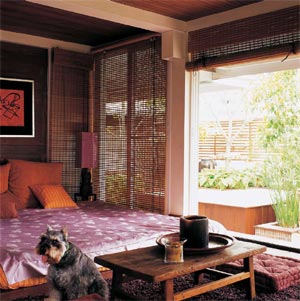 ที่ศาลาวางฟูกแบบง่าย ๆ คลุมด้วยผ้าปูเตียงจาก Pasaya หมอนจาก นันทขว้าง โคมไฟหัวเตียงที่ดลชัยดัดแปลงมาจากเชิงเทียนเก่าของคนจีนและโต๊ะไม้โบราณจากเมืองจีน