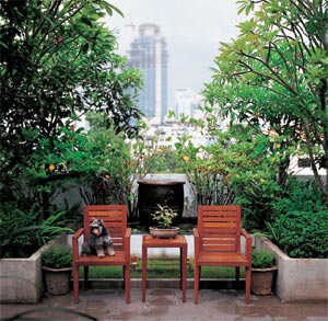 ในสวนเน้นไม้ใบอย่างที่ดลชัยชอบ และยังมีน้ำพุเล็กๆ อีกหลายจุด "หมอดูฮวงจุ้ยบอกว่า มีน้ำไหลในสวนเยอะ ๆ จะดีเพราะฮวงจุ้ยตรงนี้ชนกับสันตึกตรงข้าม ต้องเอาน้ำมาแก้เคล็ด ก็เลยมีบ่อน้ำไหลหลายจุดในสวน”จาคุซซี่ในสวนที่เขาใช้ไวนิลติดตั้งแทนการใช้กระเบื้องตามความสามารถในการรองรับน้ำหนักของดาดฟ้า