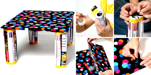1. ม้วนแมกกาซีน 1 เล่มแล้วใช้เทปกาวพันให้อยู่เพื่อทำเป็นขาโต๊ะ